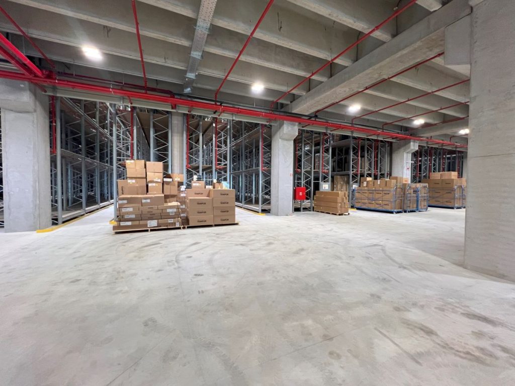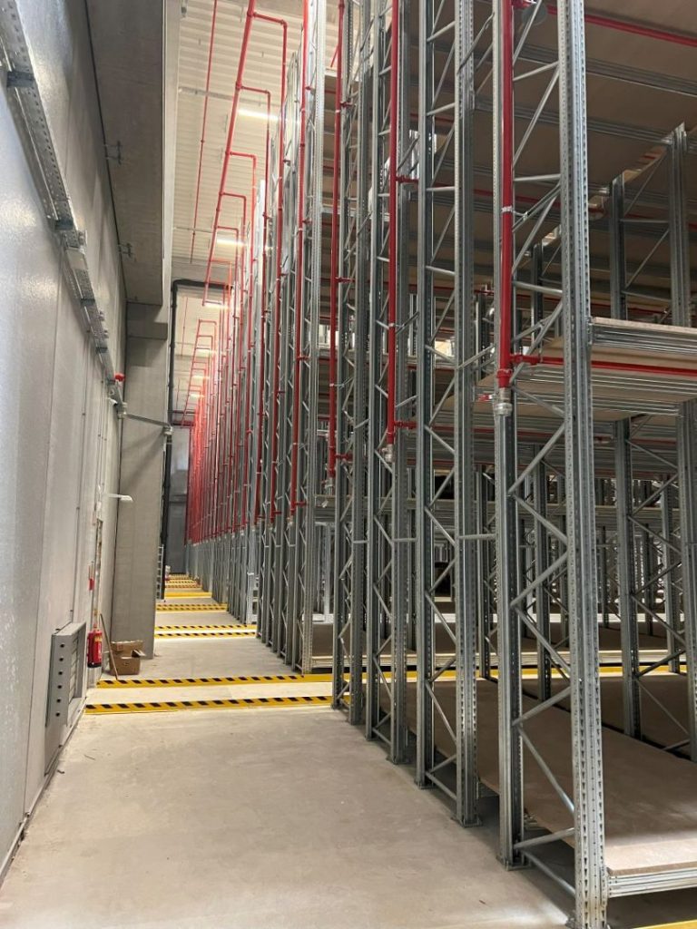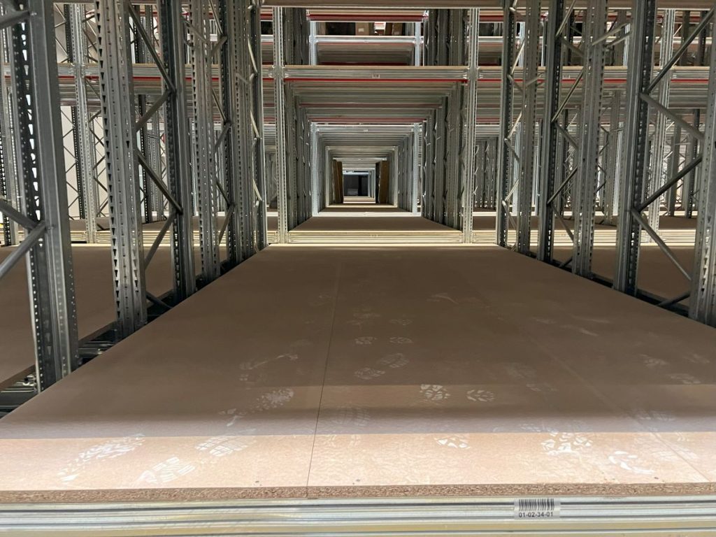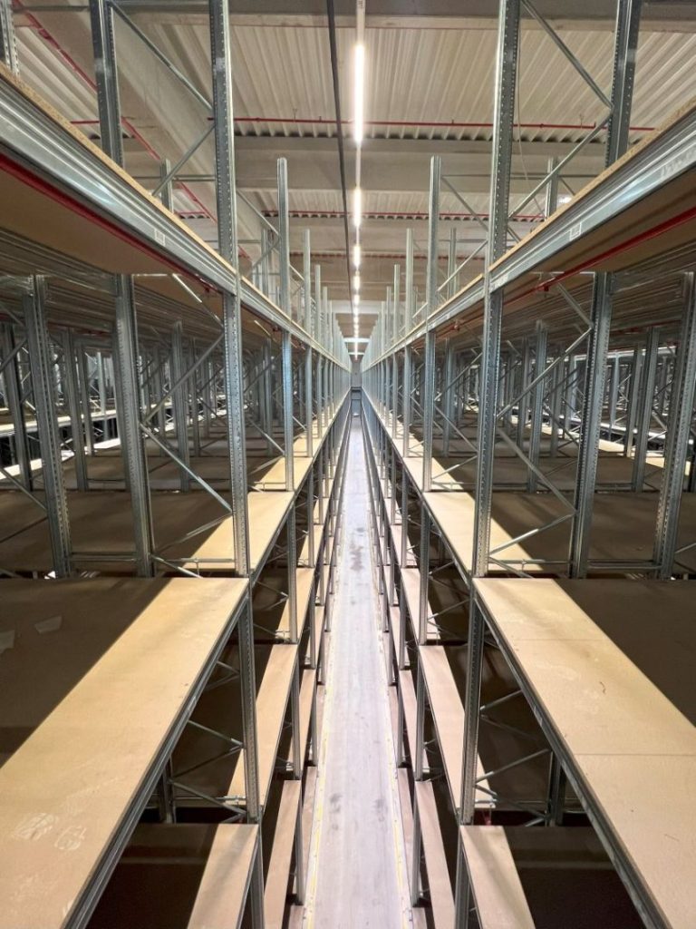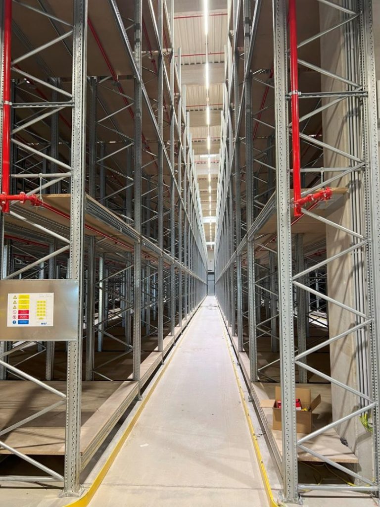 Vsak segment težkih regalov, visokih 11,5 metra, vsebuje pet nivojev nakladanja in omogoča skupno nosilnost 9.900 kg. Z uporabo opreme najvišje kakovosti smo zagotovili skoraj 19.000 paletnih mest, kar omogoča maksimalno učinkovitost in varnost.